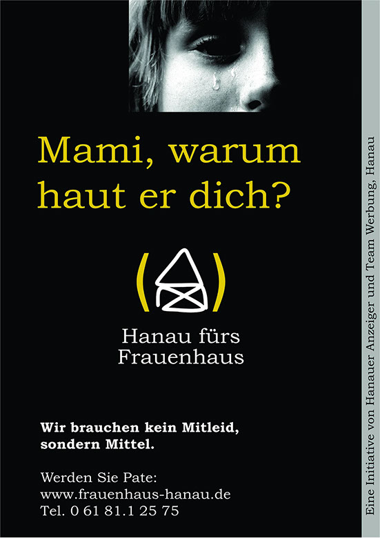 Kurz nachdem das Frauenhaus Hanau im November 2003 von der ersatzlosen Streichung der Landesmittel in Höhe von 90.000 EURO erfahren hatte, rief eine empörte und zutiefst aufgebrachte Margit Denné bei der Werbeagentur TEAMWERBUNG in Hanau an. Denn eine Werbeagentur hat Verbindungen zu Medien und Öffentlichkeit.