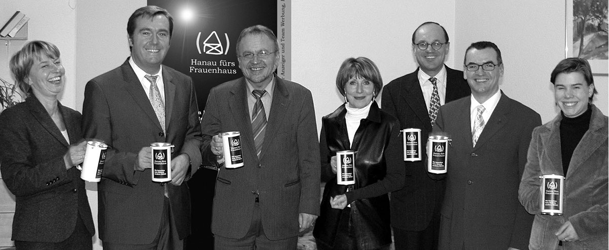 von links nach rechts: Conni Keber (†), Frauenbeauftragte MKK - Claus Kaminsky, Oberbürgermeister - Erich Pipa, Sozialdezernent MKK - Margit Denné, Frauenhaus Hanau - Thomas Bauer, Hanauer Anzeiger - Horst Fehnl, Teamwerbung - Elena Botzum, Teamwerbung - blicken zuversichtlich in die Zukunft des Hanauer Frauenhauses.